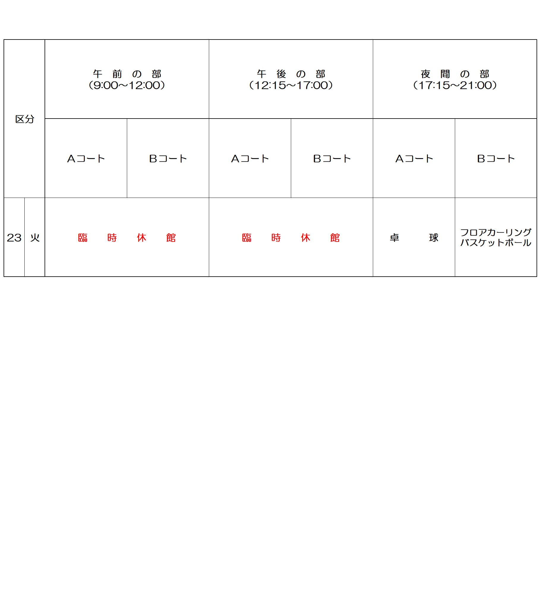 アリーナ及びトレーニング室を午前の部、午後の部を休館とさせていただきます。